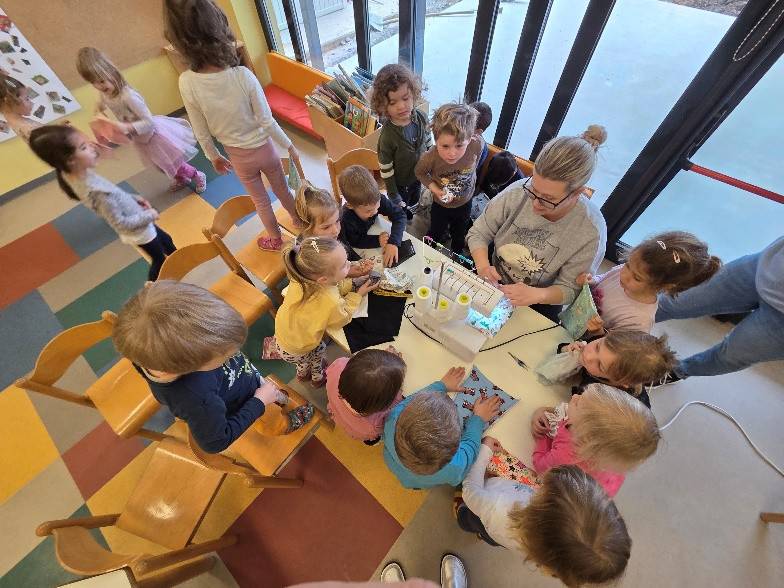 Otroci so z velikim navdušenjem opazovali, kako deluje šivalni stroj, in sodelovali pri posameznih korakih izdelave. Pod njenim toplim in potrpežljivim vodstvom so spoznavali proces šivanja ter aktivno sodelovali pri oblikovanju svojih trakov.